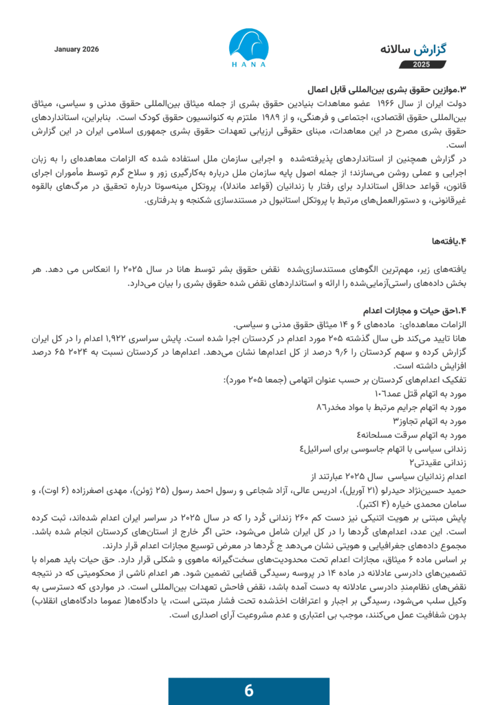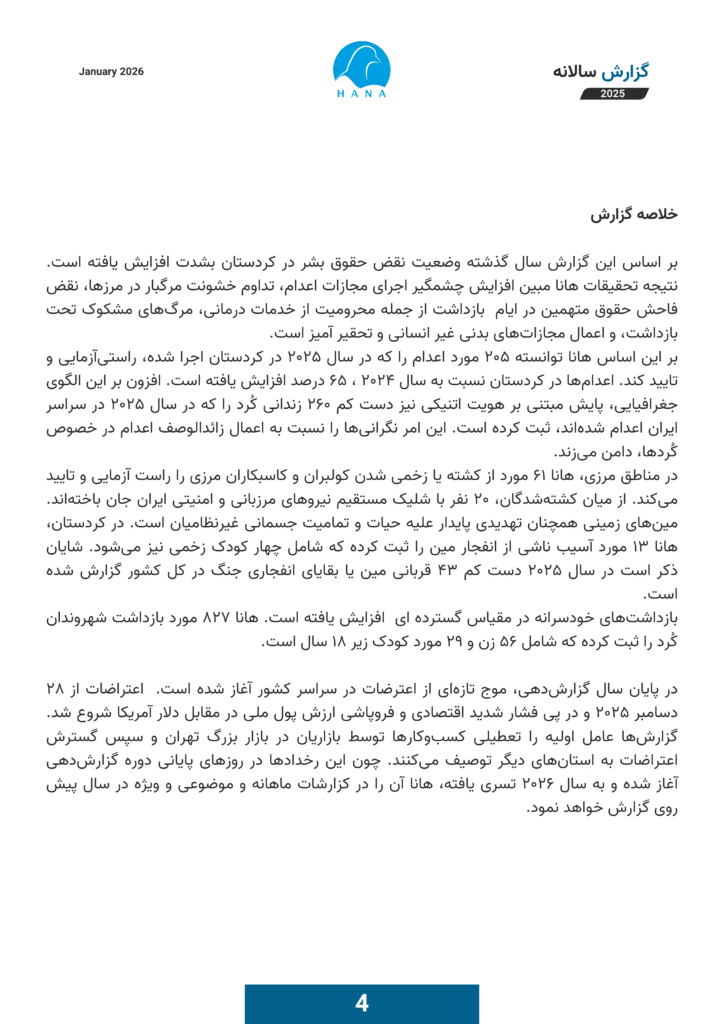 بر این اساس هانا توانسته ۲۰۵ مورد اعدام را که در سال ۲۰۲۵ در کردستان اجرا شده، راستیآزمایی و تایید کند. اعدامها در کردستان نسبت به سال ۲۰۲۴ ، ۶۵ درصد افزایش یافته است. افزون بر این الگوی جغرافیایی، پایش مبتنی بر هویت اتنیکی نیز دست کم ۲۶۰ زندانی کُرد را که در سال ۲۰۲۵ در سراسر ایران اعدام شدهاند، ثبت کرده است. این امر نگرانیها را نسبت به اعمال زائدالوصف اعدام در خصوص کُردها، دامن میزند.