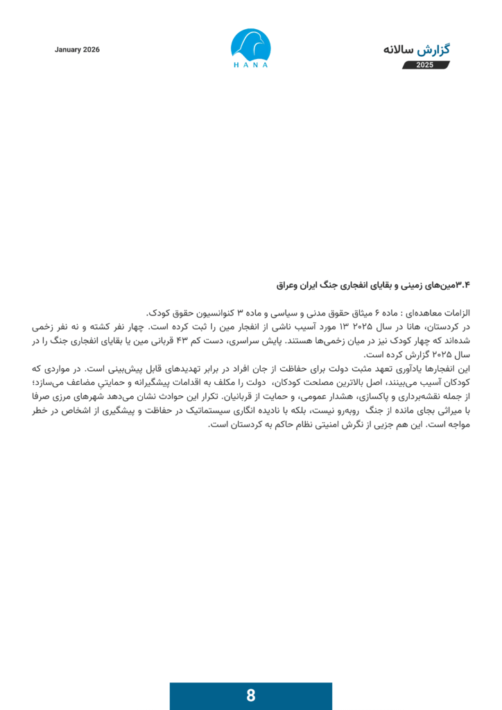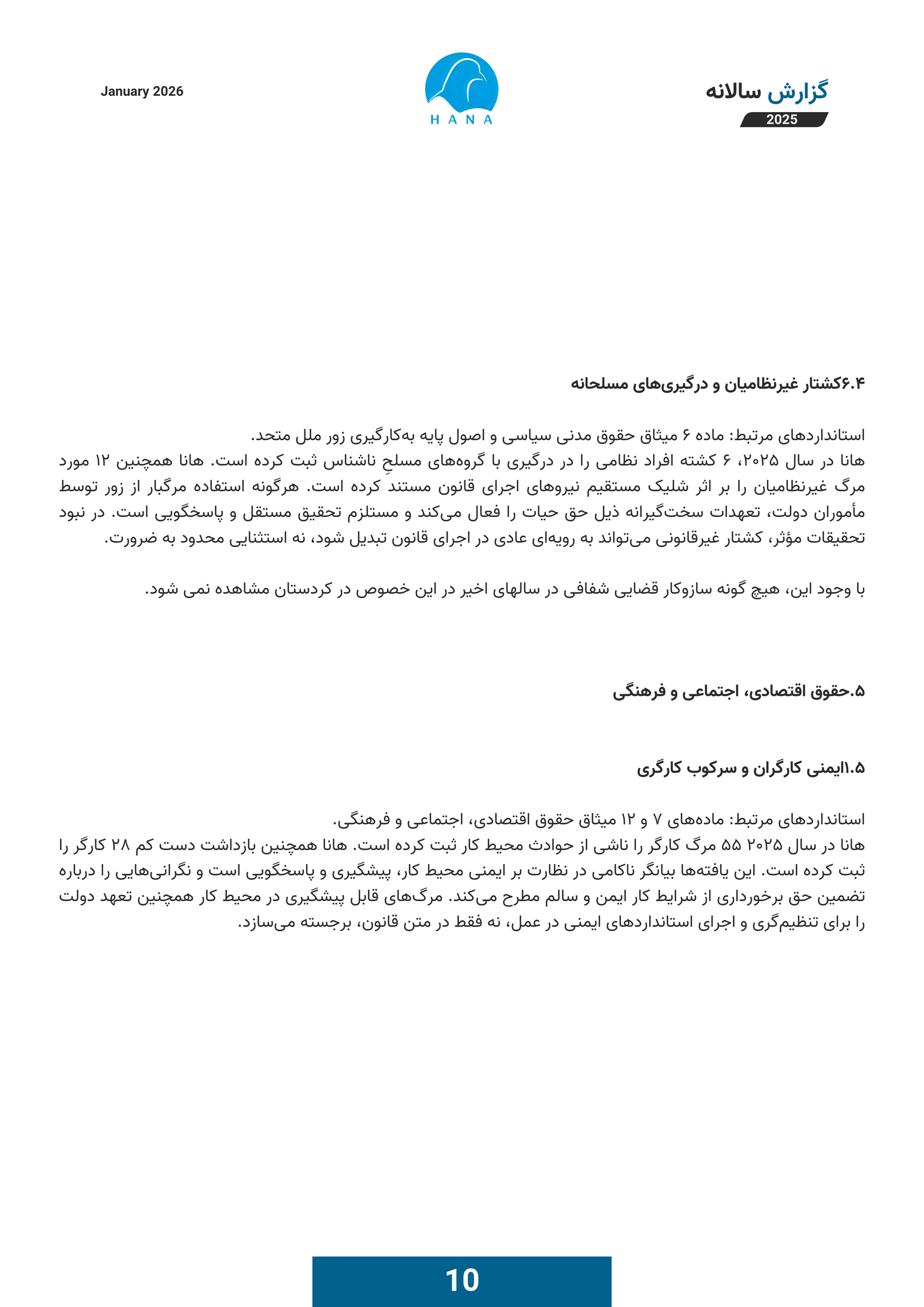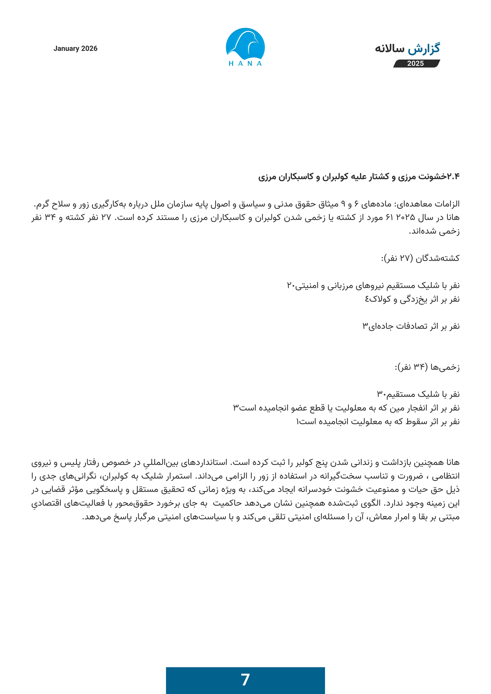 در مناطق مرزی، هانا ۶۱ مورد از کشته یا زخمی شدن کولبران و کاسبکاران مرزی را راست آزمایی و تایید میکند. از میان کشتهشدگان، ۲۰ نفر با شلیک مستقیم نیروهای مرزبانی و امنیتی ایران جان باختهاند. مینهای زمینی همچنان تهدیدی پایدار علیه حیات و تمامیت جسمانی غیرنظامیان است. در کردستان، هانا ۱۳ مورد آسیب ناشی از انفجار مین را ثبت کرده که شامل چهار کودک زخمی نیز میشود. شایان ذکر است در سال ۲۰۲۵ دست کم ۴۳ قربانی مین یا بقایای انفجاری جنگ در کل کشور گزارش شده است.