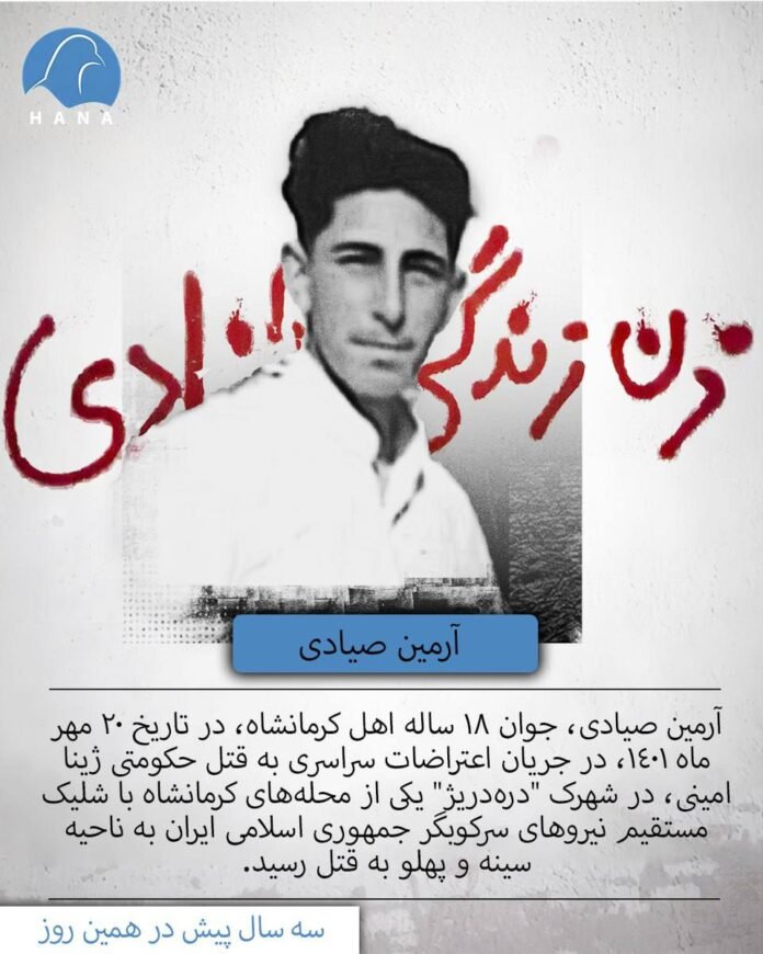 آرمین صیادی، جوان ۱۸ ساله اهل کرمانشاه، در تاریخ ٢٠ مهر ماه ١٤٠١، در جریان اعتراضات سراسری بە قتل حکومتی ژینا امینی، در شهرک “درهدریژ” یکی از محلەهای کرمانشاه با شلیک مستقیم نیروهای سرکوبگر جمهوری اسلامی ایران بە ناحیه سینه و پهلو بە قتل رسید.