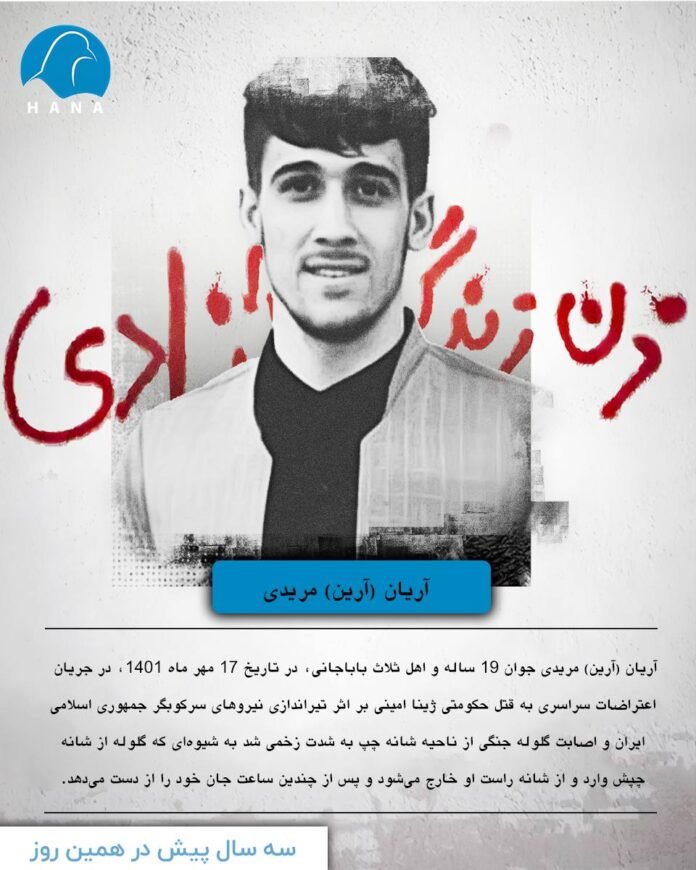 آریان (آرین) مریدی جوان ۱۹ ساله و اهل ثلاث باباجانی، در تاریخ ١٧ مهر ماه ١٤٠١، در جریان اعتراضات سراسری بە قتل حکومتی ژینا امینی بر اثر تیراندازی نیروهای سرکوبگر جمهوری اسلامی ایران و اصابت گلوله جنگی از ناحیە شانە چپ بە شدت زخمی شد بە شیوەای که گلولە از شانە چپش وارد و از شانه راست او خارج میشود و پس از چندین ساعت جان خود را از دست میدهد.