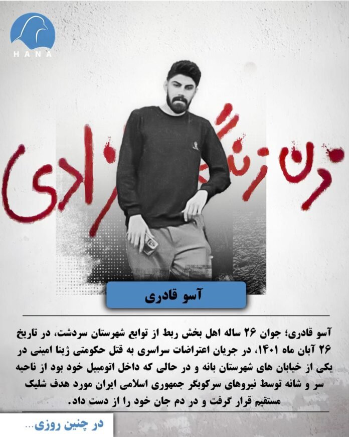 آسو قادری؛ جوان ۲۶ ساله اهل بخش ربط از توابع شهرستان سردشت، در تاریخ ٢٦ آبان ماه ١٤٠١، در جریان اعتراضات سراسری به قتل حکومتی ژینا امینی در یکی از خیابان های شهرستان بانه و در حالی که داخل اتومبیل خود بود از ناحیه سر و شانه توسط نیروهای سرکوبگر جمهوری اسلامی ایران مورد هدف شلیک مستقیم قرار گرفت و در دم جان خود را از دست داد.