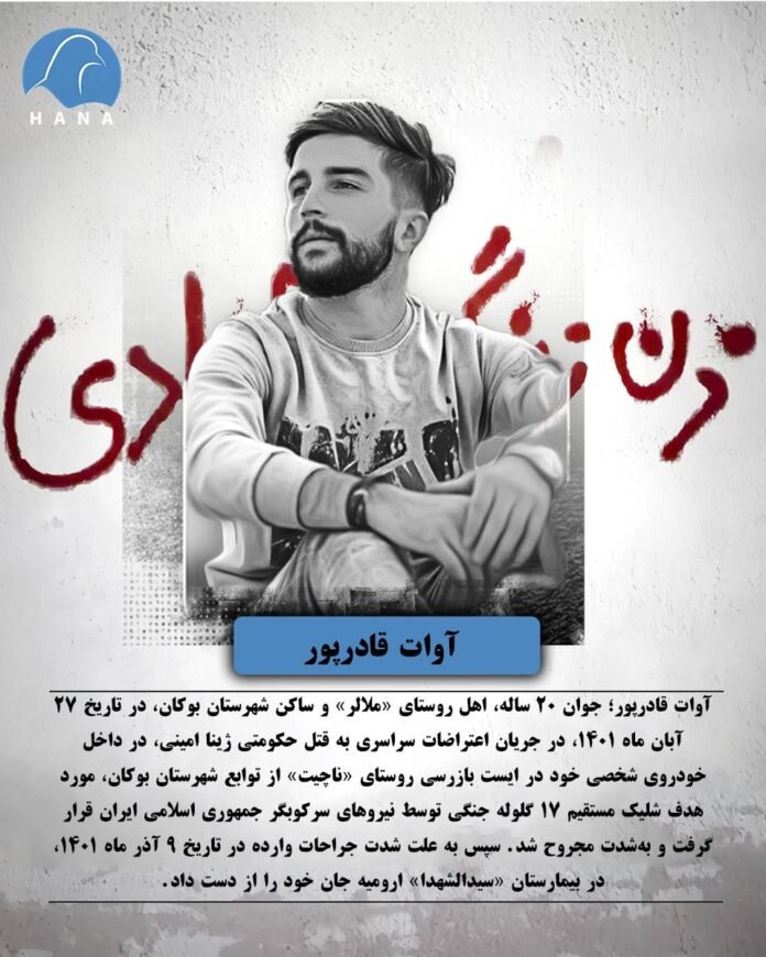 آوات قادرپور؛ جوان ۲۰ ساله، اهل روستای «ملالر» و ساکن شهرستان بوکان، در تاریخ ۲۷ آبان ماه ۱۴۰۱، در جریان اعتراضات سراسری به قتل حکومتی ژینا امینی، در داخل خودروی شخصی خود در ایست بازرسی روستای «ناچیت» از توابع شهرستان بوکان، مورد هدف شلیک مستقیم ١٧ گلوله جنگی توسط نیروهای سرکوبگر جمهوری اسلامی ایران قرار گرفت و به‌شدت مجروح شد. سپس به علت شدت جراحات وارده در تاریخ ۹ آذر ماه ۱۴۰۱، در بیمارستان‌ «سیدالشهدا» ارومیه جان خود را از دست داد.