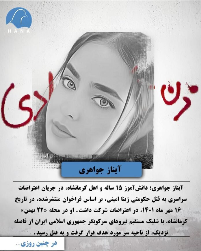 آیناز جواهری؛ دانشآموز ۱۵ ساله و اهل کرمانشاه، در جریان اعتراضات سراسری به قتل حکومتی ژینا امینی، بر اساس فراخوان منتشرشده، در تاریخ ۱۶ مهرماه ۱۴۰۱ در اعتراضات شرکت داشت. او در محله «۲۲ بهمن» کرمانشاه، با شلیک مستقیم نیروهای سرکوبگر جمهوری اسلامی ایران از فاصله نزدیک، از ناحیه سر مورد هدف قرار گرفت و به قتل رسید.