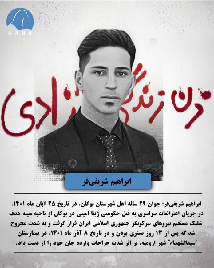 ابراهیم شریفی‌فر؛ جوان ۲۹ ساله اهل شهرستان بوکان، در تاریخ ٢٥ آبان ماه ١٤٠١، در جریان اعتراضات سراسری به قتل حکومتی ژینا امینی در بوکان از ناحیه سینه هدف شلیک مستقیم نیروهای سرکوبگر جمهوری اسلامی ایران قرار گرفت و به شدت مجروح شد که پس از ۱۳ روز بستری بودن و در تاریخ ٨ آذر ماه ١٤٠١، در بیمارستان “سیدالشهداء” شهر ارومیه، بر اثر شدت جراحات وارده جان خود را از دست داد.