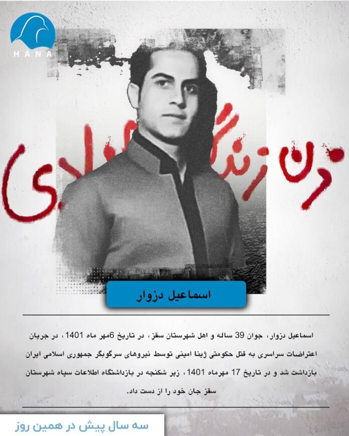 اسماعیل دزوار، جوان ۳۹ ساله و اهل شهرستان سقز، در تاریخ ٦مهر ماه ١٤٠١، در جریان اعتراضات سراسری بە قتل حکومتی ژینا امینی توسط نیروهای سرگوبگر جمهوری اسلامی ایران بازداشت شد و در تاریخ ١٧ مهرماە ١٤٠١، زیر شکنجە در بازداشتگاە اطلاعات سپاه شهرستان سقز جان خود را از دست داد.