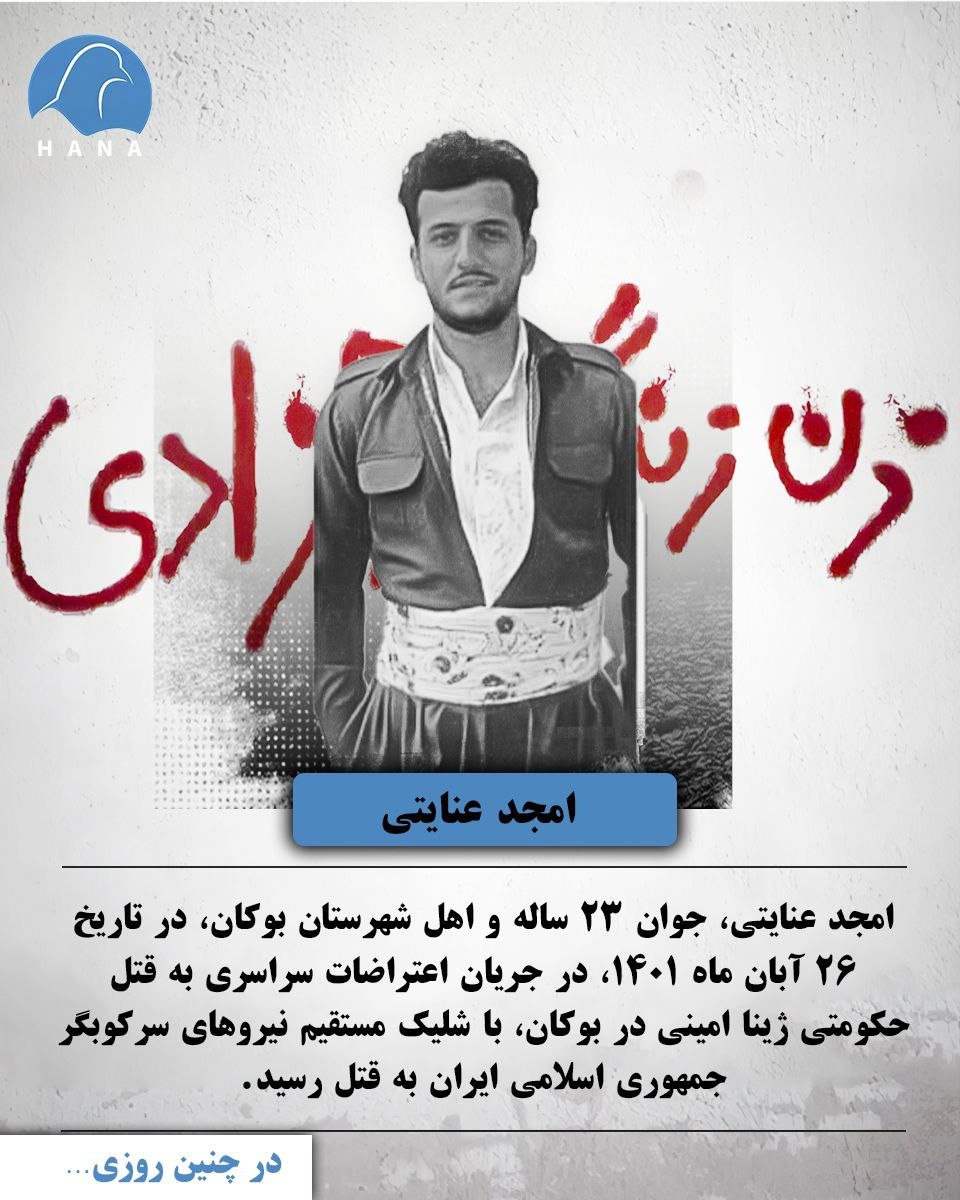 امجد عنایتی، جوان ٢٣ ساله و اهل شهرستان بوکان، در تاریخ ٢٦ آبان ماه ١٤٠١، در جریان اعتراضات سراسری به قتل حکومتی ژینا امینی در بوکان، با شلیک مستقیم نیروهای سرکوبگر جمهوری اسلامی ایران به قتل رسید.