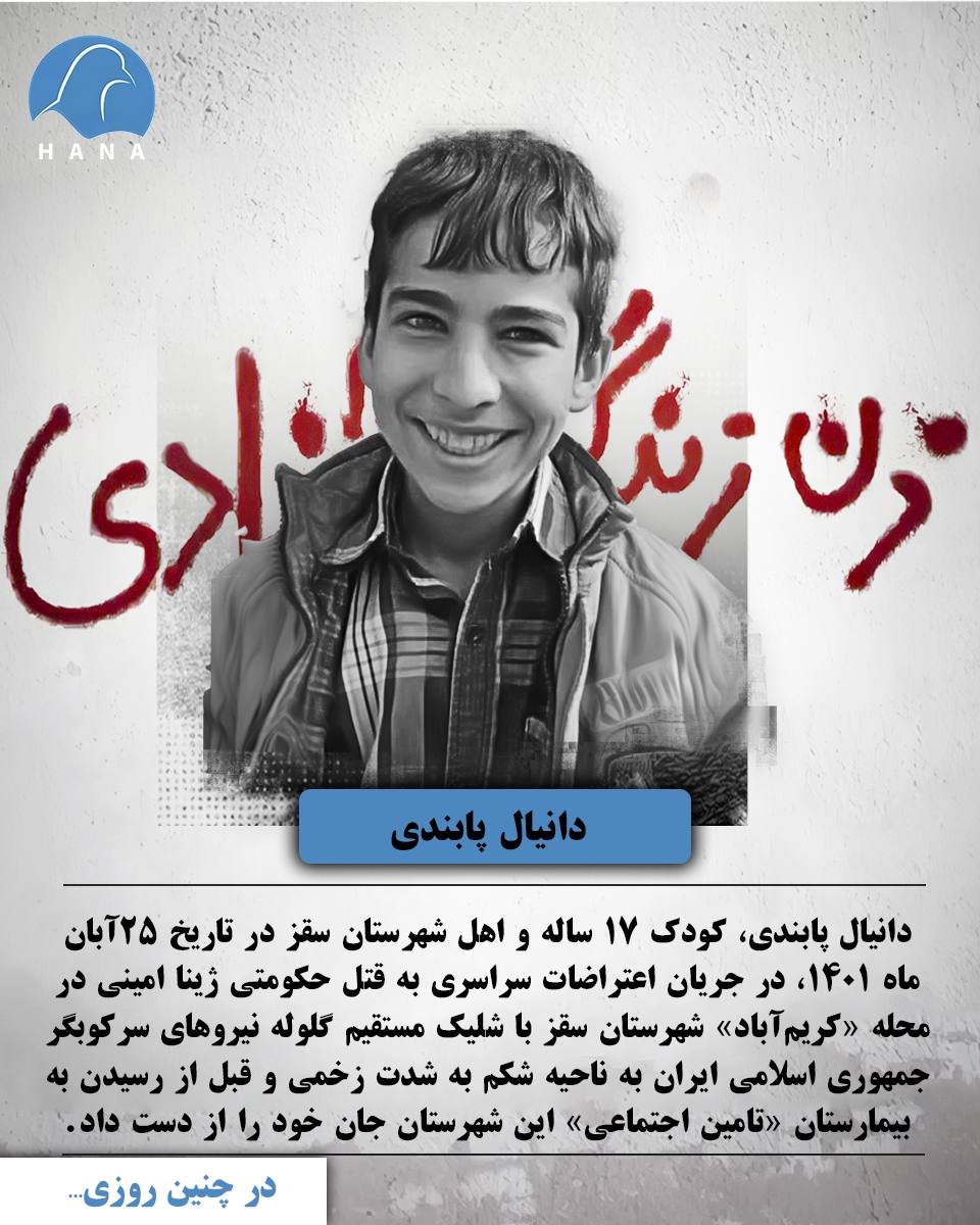 دانیال پابندی، کودک ١٧ سالە و اهل شهرستان سقز در تاریخ ۲۵ آبان ماە ‌۱۴۰۱، در جریان اعتراضات سراسری بە قتل حکومتی ژینا امینی در محله «کریم‌آباد» شهرستان سقز با شلیک مستقیم گلوله نیروهای سرکوبگر جمهوری اسلامی ایران به ناحیه شکم به‌ شدت زخمی و قبل از رسیدن به بیمارستان «تامین اجتماعی» این شهرستان جان خود را از دست داد.