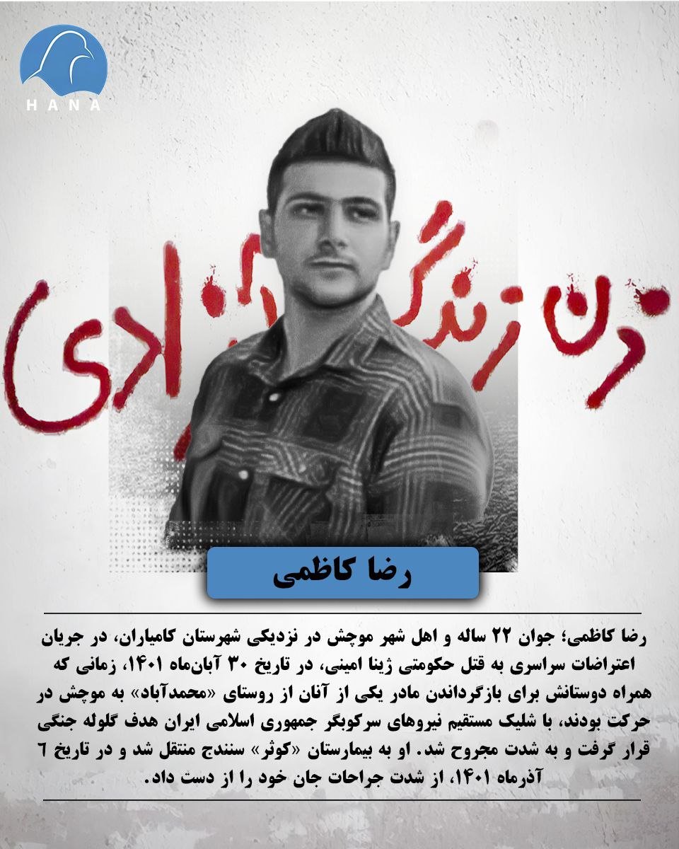 رضا کاظمی؛ جوان ٢٢ ساله و اهل شهر موچش در نزدیکی شهرستان کامیاران، در جریان اعتراضات سراسری به قتل حکومتی ژینا امینی، در تاریخ ٣٠ آبانماه ١٤٠١، زمانی که همراه دوستانش برای بازگرداندن مادر یکی از آنان از روستای «محمدآباد» به موچش در حرکت بودند، با شلیک مستقیم نیروهای سرکوبگر جمهوری اسلامی ایران هدف گلوله جنگی قرار گرفت و به شدت مجروح شد. او به بیمارستان «کوثر» سنندج منتقل شد و در تاریخ ۶ آذرماه ۱۴۰۱، از شدت جراحات جان خود را از دست داد.