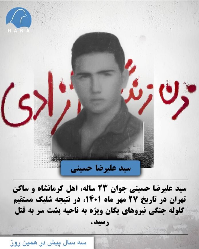 سید علیرضا حسینی جوان ٢٣ سالە، اهل کرمانشاه و ساکن تهران در تاریخ ۲۷ مهر ۱۴۰۱، در نتیجه شلیک مستقیم گلوله جنگی نیروهای یگان ویژه به ناحیه پشت سر بە قتل رسید.