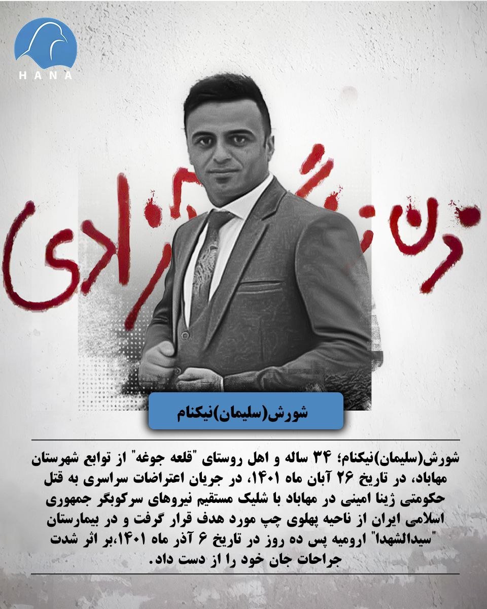 شورش(سلیمان)نیکنام؛ ٣٤ ساله و اهل روستای “قلعه جوغه” از توابع شهرستان مهاباد، در تاریخ ٢٦ آبان ماه ١٤٠١، در جریان اعتراضات سراسری به قتل حکومتی ژینا امینی در مهاباد با شلیک مستقیم نیروهای سرکوبگر جمهوری اسلامی ایران از ناحیه پهلوی چپ مورد هدف قرار گرفت و در بیمارستان “سیدالشهدا” ارومیه پس ده روز در تاریخ ٦ آذر ماه ١٤٠١،بر اثر شدت جراحات جان خود را از دست داد.