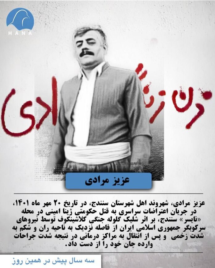 عزیز مرادی، شهروند اهل شهرستان سنندج، در تاریخ ٢٠ مهر ماه ١٤٠١، در جریان اعتراضات سراسری بە قتل حکومتی ژینا امینی در محله «نایسر» سنندج، بر اثر شلیک گلوله جنگی کلاشینکوف توسط نیروهای سرکوبگر جمهوری اسلامی ایران از فاصله نزدیک به ناحیه ران و شکم به شدت زخمی و پس از انتقال به مراکز درمانی در نتیجه شدت جراحات واردە جان خود را از دست داد.