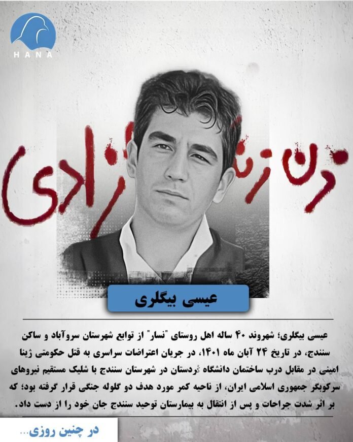 عیسی بیگلری؛ شهروند ٤٠ ساله اهل روستای “نسار” از توابع شهرستان سروآباد و ساکن سنندج، در تاریخ ٢٤ آبان ماه ١٤٠١، در جریان اعتراضات سراسری به قتل حکومتی ژینا امینی در مقابل درب ساختمان دانشگاه کُردستان در شهرستان سنندج با شلیک مستقیم نیروهای سرکوبگر جمهوری اسلامی ایران، از ناحیه کمر مورد هدف دو گلوله جنگی قرار گرفته بود؛ که بر اثر شدت جراحات و پس از انتقال به بیمارستان توحید سنندج جان خود را از دست داد.