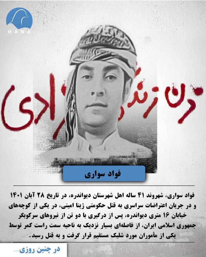 فواد سواری، شهروند ۴۱ ساله اهل شهرستان دیواندره، در تاریخ ۲۸ آبان ۱۴۰۱ و در جریان اعتراضات سراسری به قتل حکومتی ژینا امینی، در یکی از کوچههای ۱۶ متری دیواندره، پس از درگیری با دو تن از نیروهای سرکوبگر جمهوری اسلامی ایران، از فاصلهای بسیار نزدیک به ناحیه سمت راست کمر توسط یکی از مأموران مورد شلیک مستقیم قرار گرفت و به قتل رسید.