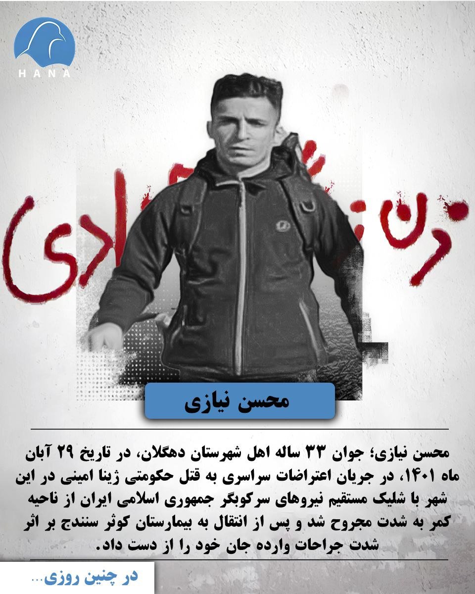محسن نیازی؛ جوان ٣٣ ساله اهل شهرستان دهگلان، در تاریخ ٢٩ آبان ماه ١٤٠١، در جریان اعتراضات سراسری به قتل حکومتی ژینا امینی در این شهر با شلیک مستقیم نیروهای سرکوبگر جمهوری اسلامی ایران از ناحیه کمر به شدت مجروح شد و پس از انتقال به بیمارستان کوثر سنندج در اثر شدت جراحات وارده جان خود را از دست داد.