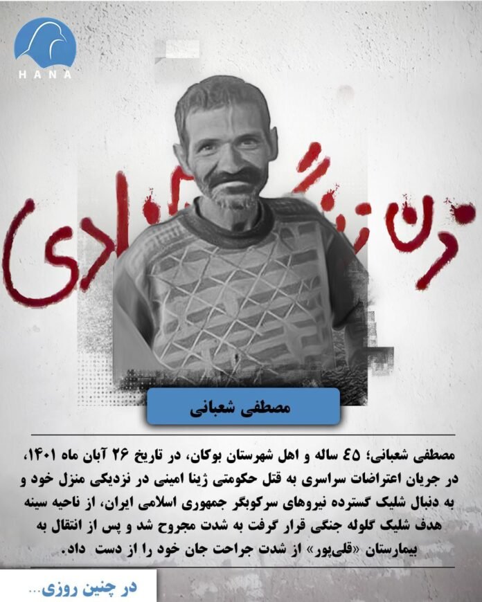 مصطفی شعبانی؛ ۴۵ ساله و اهل شهرستان بوکان، در تاریخ ٢٦ آبان ماه ١٤٠١، در جریان اعتراضات سراسری به قتل حکومتی ژینا امینی در نزدیکی منزل خود و به دنبال شلیک گسترده نیروهای سرکوبگر جمهوری اسلامی ایران، از ناحیه سینه هدف شلیک گلوله جنگی قرار گرفت به شدت مجروح شد و پس از انتقال به بیمارستان «قلیپور» از شدت جراحت جان خود را از دست داد.