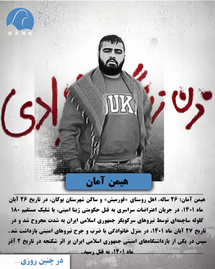 هیمن آمان؛ ۲۶ ساله، اهل روستای «قورمیش» و ساکن شهرستان بوکان، در تاریخ ٢٦ آبان ماە ١٤٠١، در جریان اعتراضات سراسری به قتل حکومتی ژینا امینی، با شلیک مستقیم ۱۸۰ گلوله ساچمهای توسط نیروهای سرکوبگر جمهوری اسلامی ایران به شدت مجروح شد و در تاریخ ۲۷ آبان ماه ۱۴۰۱، در منزل خانوادگی با ضرب و جرح نیروهای امنیتی بازداشت شد. سپس در یکی از بازداشتگاههای امنیتی جمهوری اسلامی ایران بر اثر شکنجه در تاریخ ٢ آذر ماه ١٤٠١، بە قتل رسید.