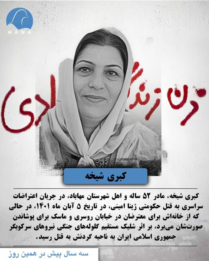 کبری شیخه، مادر ۵۲ ساله و اهل شهرستان مهاباد، در جریان اعتراضات سراسری بە قتل حکومتی ژینا امینی، در تاریخ ۵ آبان ماە ۱۴۰۱، در حالیکه از خانهاش برای معترضان در خیابان روسری و ماسک برای پوشاندن صورتشان میبرد، بر اثر شلیک مستقیم گلولههای جنگی نیروهای سرکوبگر جمهوری اسلامی ایران به ناحیە گردنش بە قتل رسید.