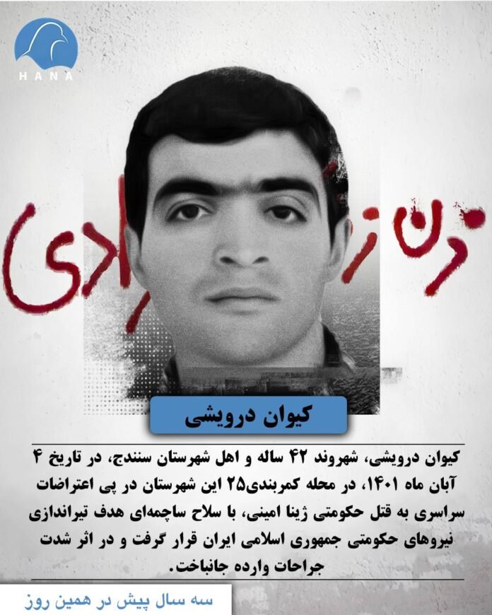 کیوان درویشی، شهروند ۴۲ ساله و اهل شهرستان سنندج، در تاریخ ٤ آبان ماه ١٤٠١، در محله کمربندی٢٥ این شهرستان در پی اعتراضات سراسری به قتل حکومتی ژینا امینی، با سلاح ساچمهای هدف تیراندازی نیروهای حکومتی جمهوری اسلامی ایران قرار گرفت و در اثر شدت جراحات وارده جانباخت.