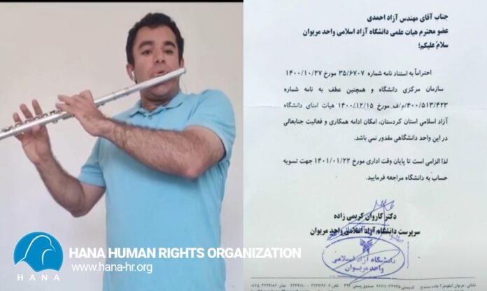 بەپێی ئەم راپۆرتە، ئەندازیار "ئازاد ئەحمەدزادە" مامۆستای بواری مێعماری لە زانستگای ئازادی مەریوان و مامۆستای موزیک، لە رۆژانی رابردوودا لە رێگای نامەیەکەوە لە بڕیاری دەرکردنەکەی ئاگاداریان کردووە.