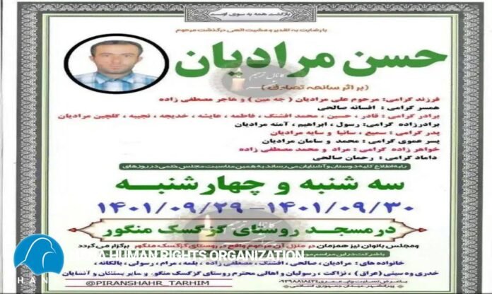 هانا: ڕۆژی دووشەممە”٢٨ی ئازەری١٤٠١”شوانێک خەڵکی ئاوای”گەزگەسەک” (مەنگواران)ی سەر بە پیرانشار بە ناوی حەسەن مورادیان ٣٨ ساڵە کوڕی عەلی بە تەقەی هێزە چەکدارەکانی سەر سنوور گیانی لەدەستدا.