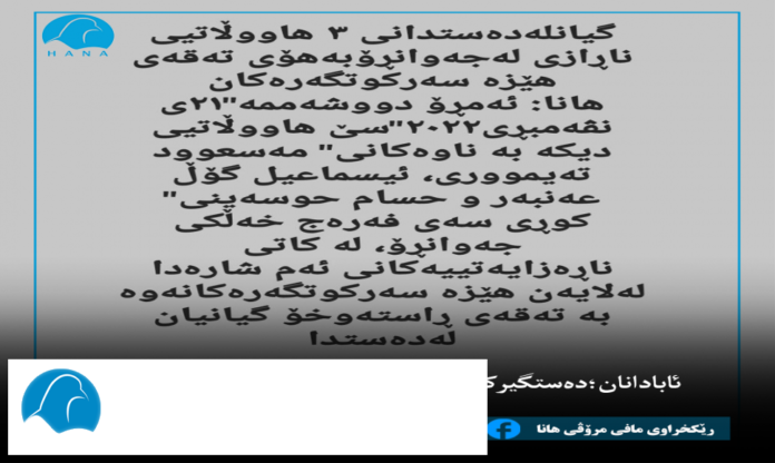 هانا: ئەمڕۆ دووشەممە”۲۱ی نڤەمبڕی۲۰۲۲”سێ هاووڵاتیی دیکە بە ناوەکانی” مەسعوود تەیمووری، ئیسماعیل گۆڵ عەنبەر و حسام حوسەینی” کوڕی سەی فەرەج خەڵکی جەوانڕۆ، لە کاتی ناڕەزایەتییەکانی ئەم شارەدا لەلایەن هێزە سەرکوتگەرەکانەوە بە تەقەی ڕاستەوخۆ گیانیان لەدەستدا.