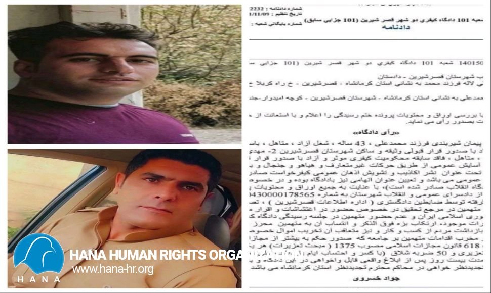 ئەم دوو هاووڵاتییە لە"٩ی ۱۱ی ١٤٠١"لە لایەن لقی ١٠ی دادگای ئینقلابی قەسر شیرینەوە بە غیابی بە تۆمەتی تێکدانی نەزمی گشتی و ئاسوودەیی لە ڕێگەی جموجۆڵی ناتەقلیدی و ژاوەژاو و مشتومڕ، ڕێگریکردن لە کاروبار و تێکدانی موڵک و ماڵی خەڵک، دەستبەسەر کراون بەو سزایە مەحکوم کران .