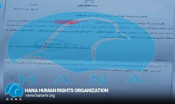 بەپێی هەواڵی گەیشتوو بە ڕێکخراوی مافی مرۆڤی هانا: بەڕێوەبردنی پەروەردەی مەریوان بۆ دروستکردنی ترساندن لە نێو مامۆستایانی قوتابخانەکان و ڕێگریکردن لە بەشداریکردنیان لە کۆبونەوە و مانگرتن و ناڕەزایەتییەکاندا، بە پێی بڕگەی ٣٣ سکاڵا لە “٥/٨/١٤٠١” ناردووە.. مادەی هەشتەم لە یاسای مامەڵەکردن لەگەڵ تاوانە کارگێڕییەکاندا بووەتە دەستەی مامەڵەکردن لەگەڵ تاوانە کارگێڕییەکان.