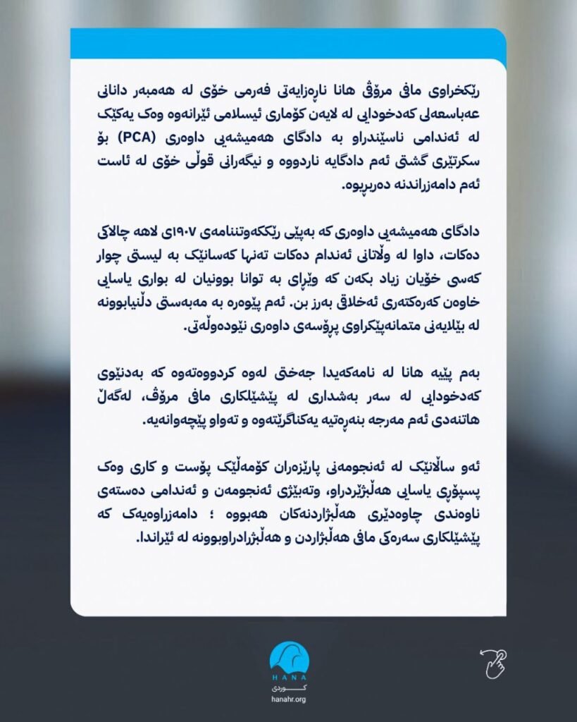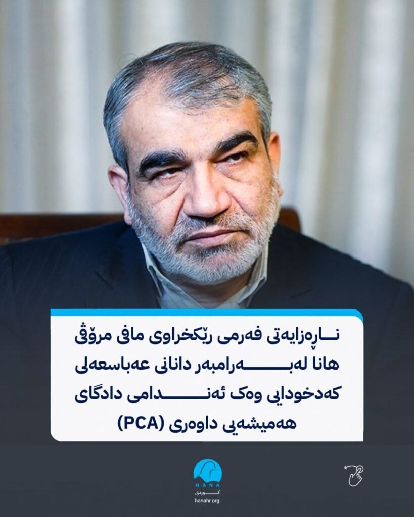 رێکخراوی مافی مرۆڤی هانا ناڕەزایەتی فەرمی خۆی لە هەمبەر دانانی عەباسعەلی کەدخودایی لە لایەن کۆماری ئیسلامی ئێرانەوە وەک یەکێک لە ئەندامی ناسێندراو بە دادگای هەمیشەیی داوەری (PCA) بۆ سکرتێری گشتی ئەم دادگایە ناردووە و نیگەرانی قوڵی خۆی لە ئاست ئەم دامەزراندنە دەربڕیوە.