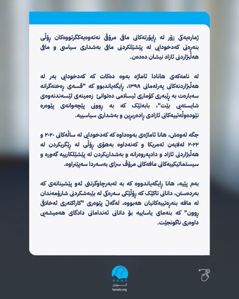 لە نامەکەی هانادا ئاماژە بەوە دەکات کە کەدخودایی بەر لە هەڵبژاردنەکانی پەرلەمانی ١٣٩٨، ڕایگەیاندبوو کە “قسەی ڕەخنەگرانە سەبارەت بە ڕێبەری کۆماری ئیسلامی دەتوانێ زەمینەی لێسەندنەوەی شایستەیی بێت”، بابەتێک کە بە ڕوونی پێچەوانەی پێوەرە نێودەوڵەتییەکانی ئازادی ڕادەربڕین و بەشداری سیاسییە.