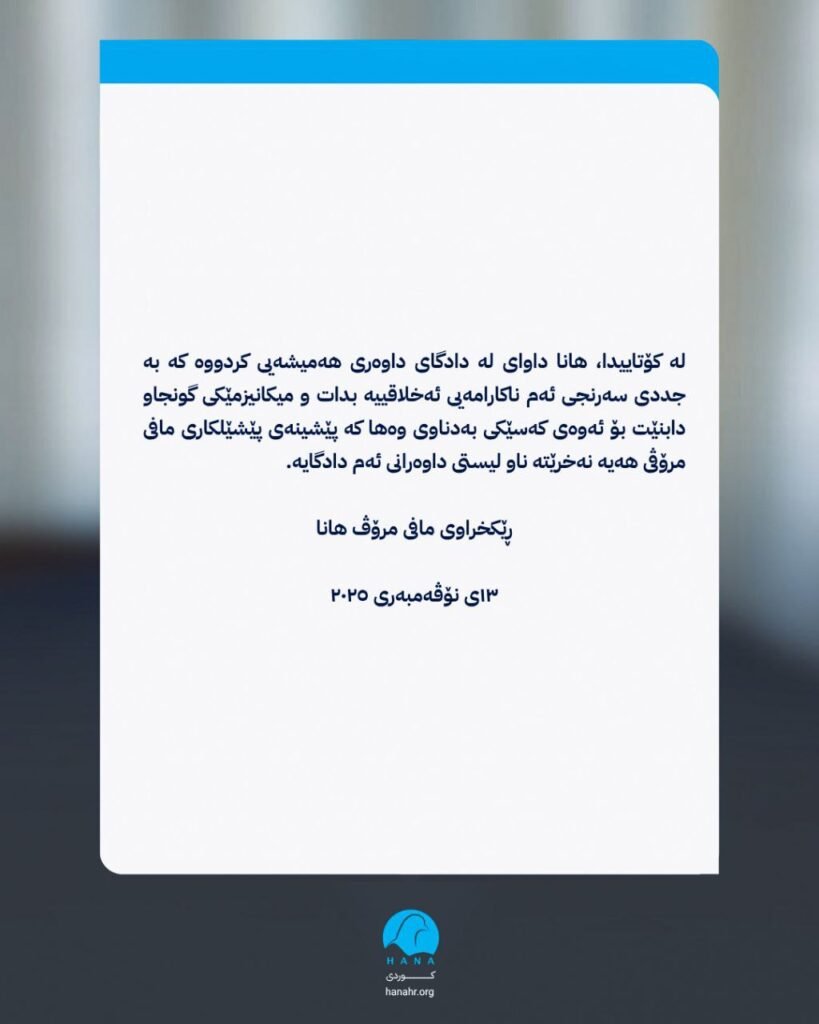 بەم پێیە هانا لە نامەکەیدا جەختی لەوە کردووەتەوە کە بەدنێوی کەدخودایی لە سەر بەشداری لە پێشێلکاری مافی مرۆڤ، لەگەڵ هاتنەدی ئەم مەرجە بنەڕەتیە یەکناگرێتەوە و تەواو پێچەوانەیە.