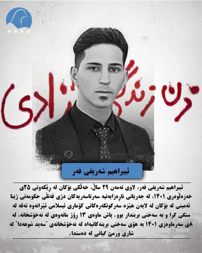 ئیبراهیم شەریفی فەر، لاوی تەمەن ۲۹ساڵ، خەڵکی بۆکان لە ڕێکەوتی ۲٥ی خەزەڵوەری ۱٤۰۱، لە جەریانی ناڕەزایەتیە سەرتاسەریەکان دژی قەتڵی حکومەتی ژینا ئەمینی لە بۆکان لە لایەن هێزە سەرکوتکەرەکانی کۆماری ئیسلامی ئێرانەوە تەقە لە سنگی کرا و بە سەختی بریندار بوو. پاش ماوەی ١٣ ڕۆژ مانەوەی لە نەخۆشخانە، لە ٨ی سەرماوەزی ١٤٠١ بە هۆی سەختی برینەکانیەاە لە نەخۆشخانەی “سەید شوهەدا” لە شاری ورمێ گیانی لە دەستدا.