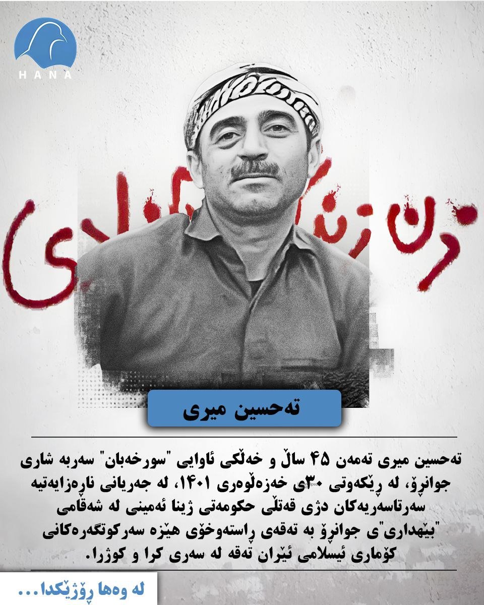 تەحسین میری تەمەن ٤٥ ساڵ و خەڵکی ئاوایی “سورخەبان” سەربە شاری جوانڕۆ، لە ڕێکەوتی ۳۰ی خەزەڵوەری ۱٤۰۱، لە جەریانی ناڕەزایەتیە سەرتاسەریەکان دژی قەتڵی حکومەتی ژینا ئەمینی لە شەقامی “بێهداری”ی جوانڕۆ بە تەقەی ڕاستەوخۆی هێزە سەرکوتگەرەکانی کۆماری ئیسلامی ئێران تەقە لە سەری کرا و کوژرا.