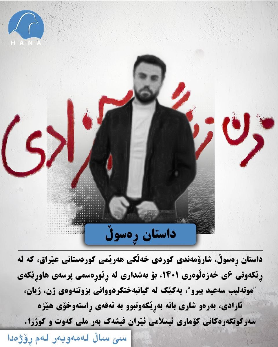 داستان ڕەسوڵ، شارۆمەندی کوردی خەڵکی هەرێمی کوردستانی عێراق، کە لە ڕێکەوتی ٦ی خەزەڵوەری ۱٤۰۱، بۆ بەشداری لە ڕێوڕەسمی پرسەی هاوڕێکەی “موتەلیب سەعید پیرو”، یەکێک لە گیانبەختکردووانی بزوتنەوەی ژن، ژیان، ئازادی، بەرەو شاری بانە بەڕێکەوتبوو بە تەقەی ڕاستەوخۆی هێزە سەرکوتگەرەکانی کۆماری ئیسلامی ئێران فیشەک بەر ملی کەوت و کوژرا.