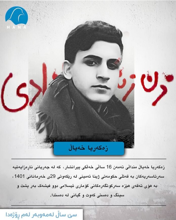زەکەریا خەیاڵ منداڵی تەمەن ۱٦ ساڵی خەڵکی پیرانشار،کە لە جەریانی ناڕەزایەتیە سەرتاسەریەکان بەقەتڵی حکومەتی ژینا ئەمینی لەی ڕێکەوتی ۲۹ی خەرمانانی ۱٤۰۱،بەهۆی تەقەی هێزە سەرکووتگەرەکانی کۆماری ئیسلامی دو فیشەک بەر پشت و سینگ و دەستی کەوت و گیانی لە دەست دا.