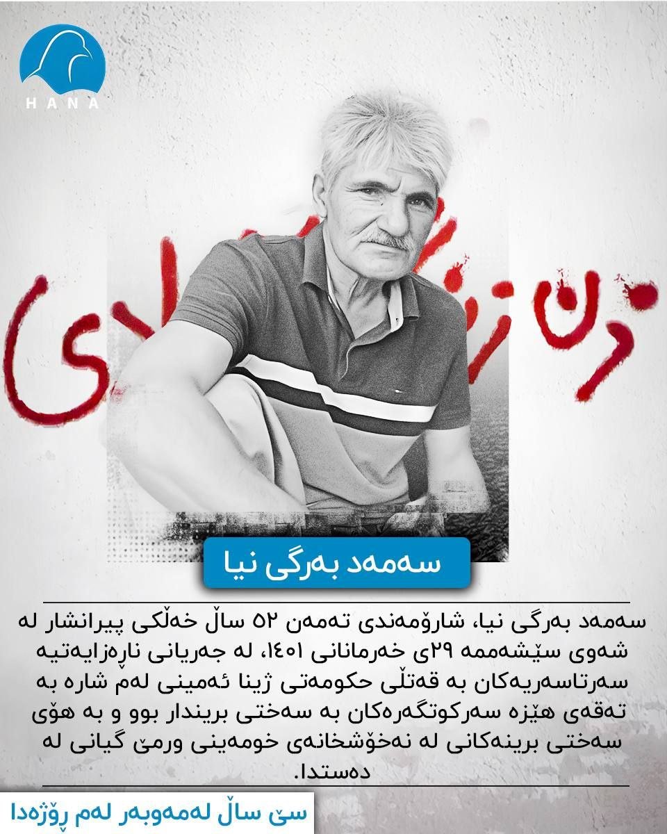 سەمەد بەرگی نیا، شارۆمەندی تەمەن ٥۲ ساڵ خەڵکی پیرانشار لە شەوی سێشەممە ۲۹ی خەرمانانی ١٤٠١، لە جەریانی ناڕەزایەتیە سەرتاسەریەکان بە قەتڵی حکومەتی ژینا ئەمینی لەم شارە بە تەقەی هێزە سەرکوتگەرەکان بە سەختی بریندار بوو و بە هۆی سەختی برینەکانی لە نەخۆشخانەی خومەینی ورمێ گیانی لە دەستدا.