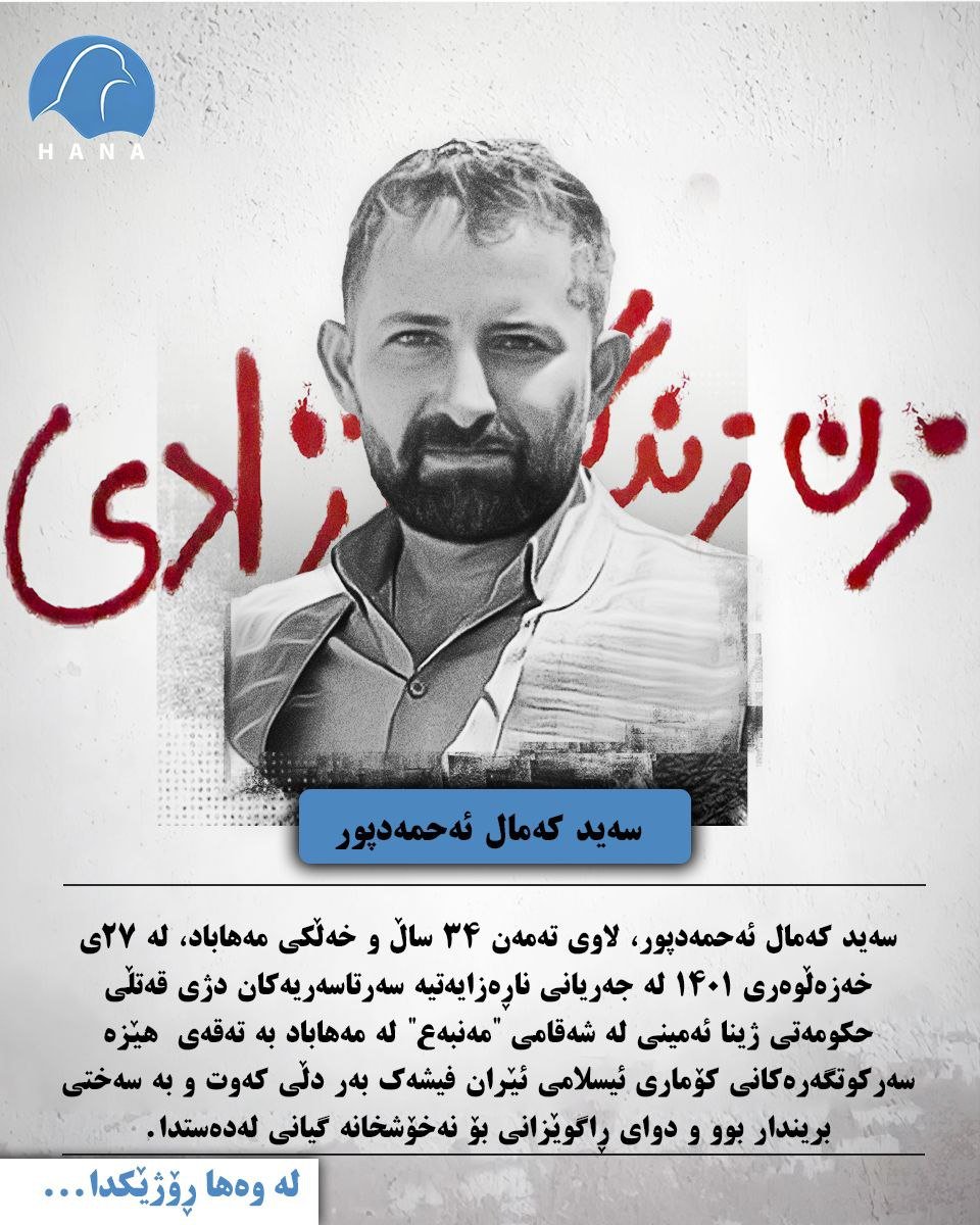 سەید کەمال ئەحمەدپور، لاوی تەمەن ٣٤ ساڵ و خەڵکی مەهاباد، لە ۲٧ی خەزەڵوەری ١٤٠١ لە جەریانی ناڕەزایەتیە سەرتاسەریەکان دژی قەتڵی حکومەتی ژینا ئەمینی لە شەقامی “مەنبەع” لە مەهاباد بە تەقەی هێزە سەرکوتگەرەکانی کۆماری ئیسلامی ئێران فیشەک بەر دڵی کەوت و بە سەختی بریندار بوو و دوای ڕاگوێزانی بۆ نەخۆشخانە گیانی لەدەستدا.