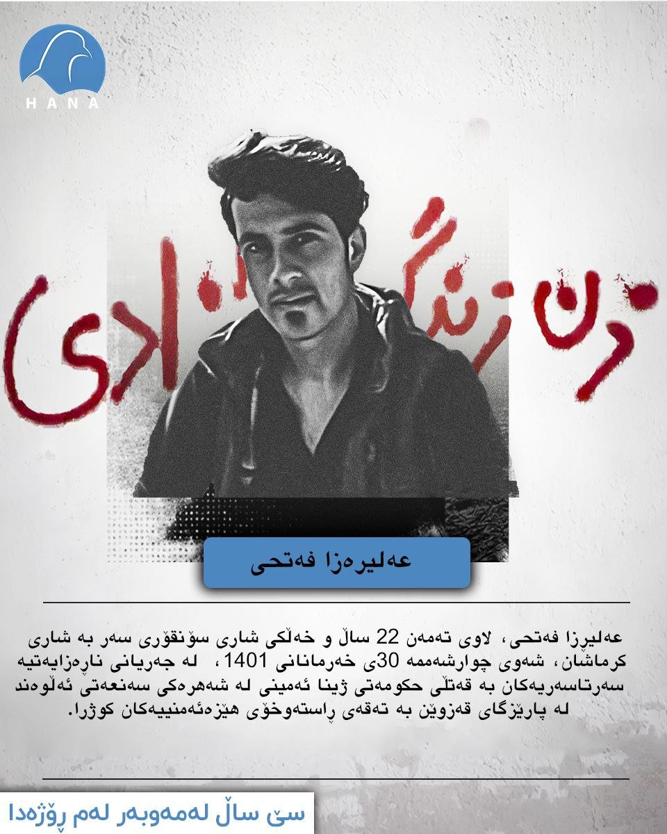 عەلیڕزا فەتحی، لاوی تەمەن ۲۲ ساڵ و خەڵکی شاری سۆنقۆری سەر بە شاری کرماشان، شەوی چوارشەممە ۳۰ی خەرمانانی ۱٤۰۱، لە جەریانی ناڕەزایەتیە سەرتاسەریەکان بە قەتڵی حکومەتی ژینا ئەمینی لە شەهرەکی سەنعەتی ئەڵوەند لە پارێزگای قەزوێن بە تەقەی ڕاستەوخۆی هێزەئەمنییەکان کوژرا.