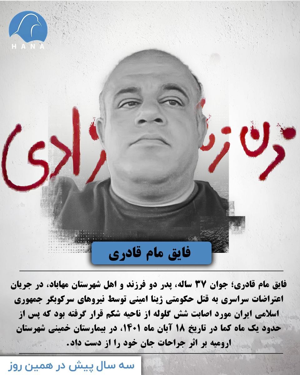 فایەق مام قادری تەمەن ٣٧ساڵ، باوکی دوو منداڵ، خەڵکی مەهاباد، لە جەریانی ناڕەزایەتیە سەرتاسەریەکان دژی قەتڵی حکومەتی ژینا ئەمینی لە لایەن هێزە سەرکوتگەرەکانەوە کرایە ئامانج و شەش فیشەک بەر سکی کەوتبوو کە دوای نزیک بە یەک مانگ مانەوەی لە حاڵەتی کۆما، لە رێکەوتی ١٨ی خەزەڵوەری ١٤٠١، لە نەخۆشخانەی خومەینی ورمی گیانی لە دەستدا.