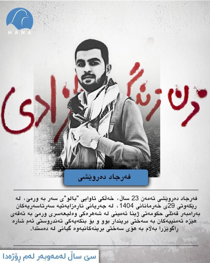 فەرجاد دەروێشی تەمەن ٢٣ ساڵ، خەڵکی ئاوایی “بالو”ی سەر بە ورمێ، لە رێکەوتی ٢٩ی خەرمانانی ١٤٠٤، لە جەریانی ناڕەزایەتیە سەرتاسەریەکان بەرامبەر قەتڵی حکومەتی ژینا ئەمینی لە شەهرەکی وەلیعەسری ورمێ بە تەقەی هێزە ئەمنییەکان بە سەختی بریندار بوو و بۆ بنکەیەکی تەندروستی ئەم شارە ڕاگوێزرا بەڵام بە هۆی سەختی برینەکانیەوە گیانی لە دەستدا.