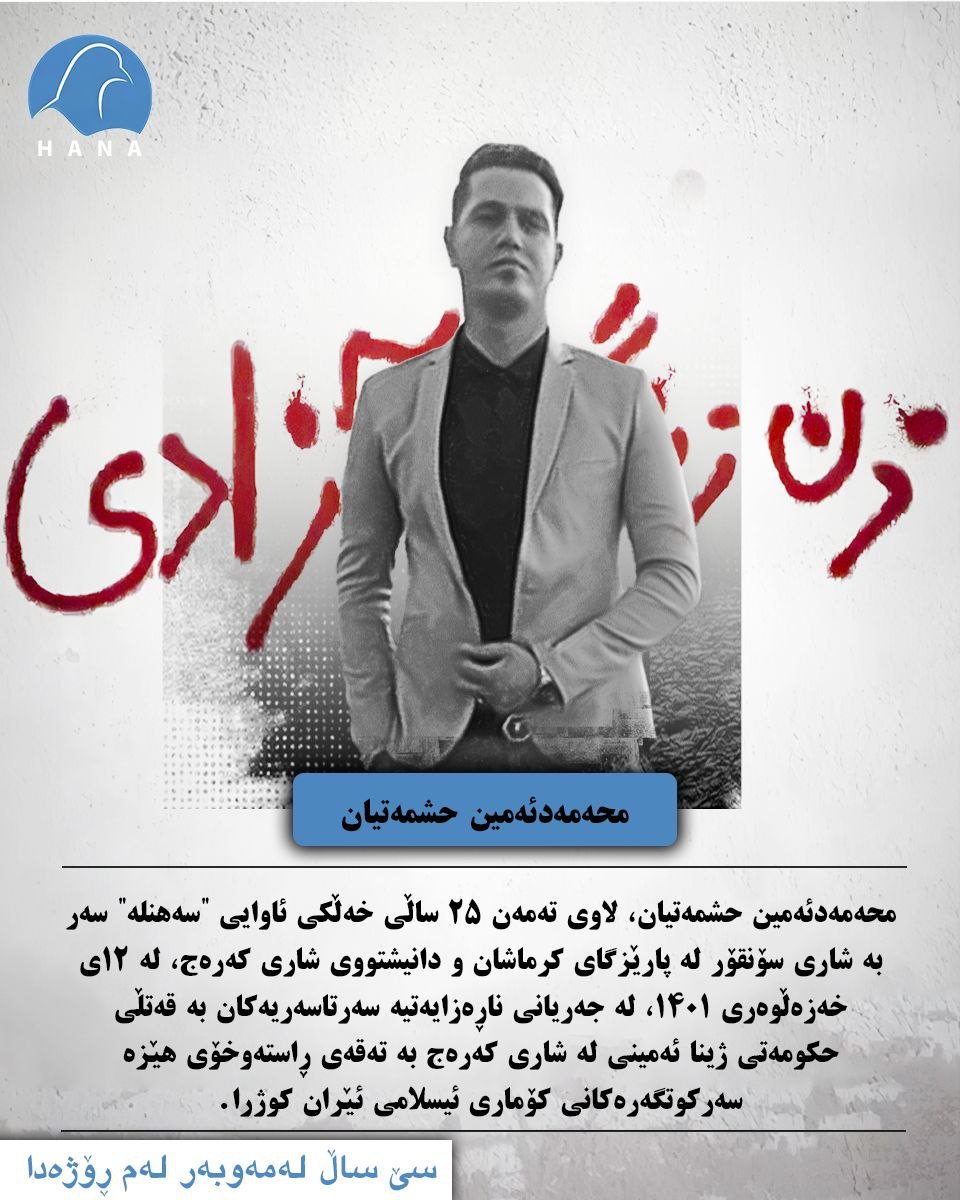 محەممەد ئەمین حشمەتیان، لاوی تەمەن ٢٥ ساڵ خەڵکی ئاوایی “سەهنلە” سەر بە شاری سۆنقۆر لە پارێزگای کرماشان و دانیشتووی شاری کەرەج، لە ١٢ی خەزەڵوەری ١٤٠١، لە جەریانی ناڕەزایەتیە سەرتاسەریەکان بە قەتڵی حکومەتی ژینا ئەمینی لە شاری کەرەج بە تەقەی ڕاستەوخۆی هێزە سەرکوتگەرەکانی کۆماری ئیسلامی ئێران کوژرا.