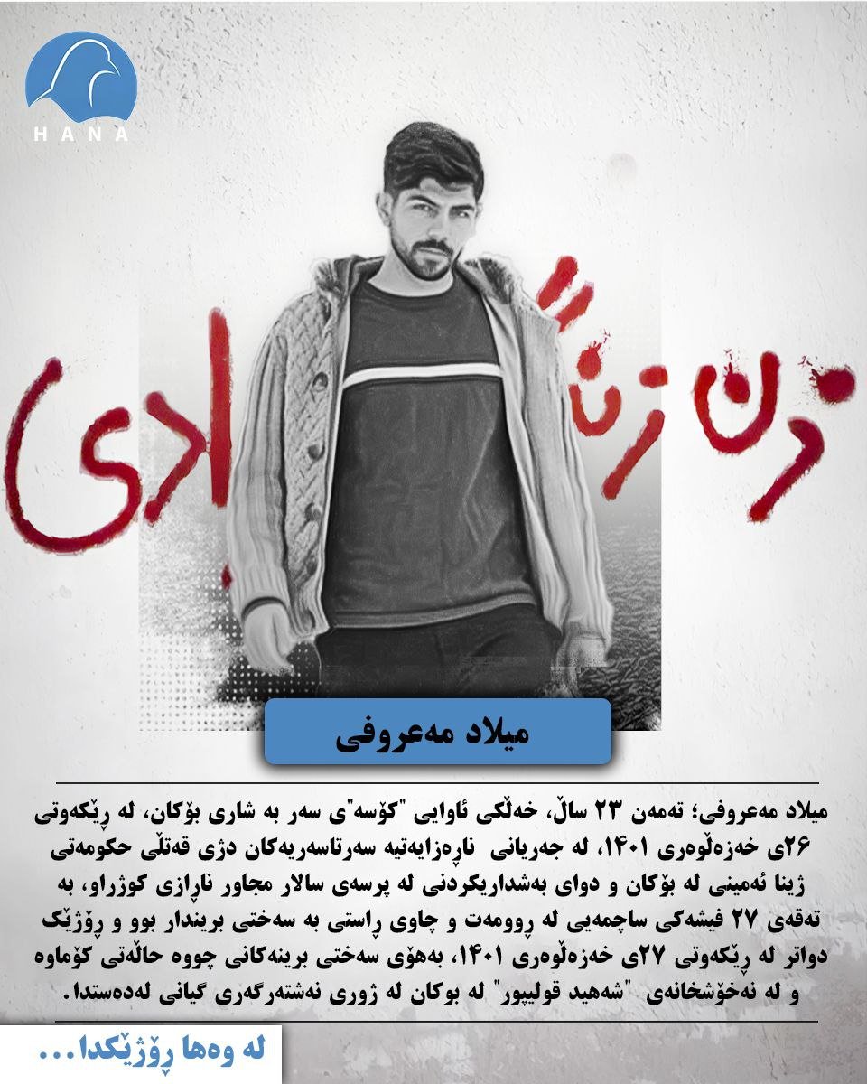 میلاد مەعروفی تەمەن ٢٣ ساڵ، خەڵکی ئاوایی “کۆسە”ی سەر بە شاری بۆکان، لە ڕێکەوتی ۲٦ی خەزەڵوەری ١٤٠١، لە جەریانی ناڕەزایەتیە سەرتاسەریەکان دژی قەتڵی حکومەتی ژینا ئەمینی لە بۆکان و دوای بەشداریکردنی لە پرسەی سالار مجاور ناڕازی کوژراو، بە تەقەی ٢٧ فیشەکی ساچمەیی لە ڕوومەت و چاوی ڕاستی بە سەختی بریندار بوو و ڕۆژێک دواتر لە ڕێکەوتی ۲۷ی خەزەڵوەری ١٤٠١، بەهۆی سەختی برینەکانی چووە حاڵەتی کۆماوە و لە نەخۆشخانەی “شەهید قولیپور” لە بوکان لە ژوری نەشتەرگەری گیانی لەدەستدا.