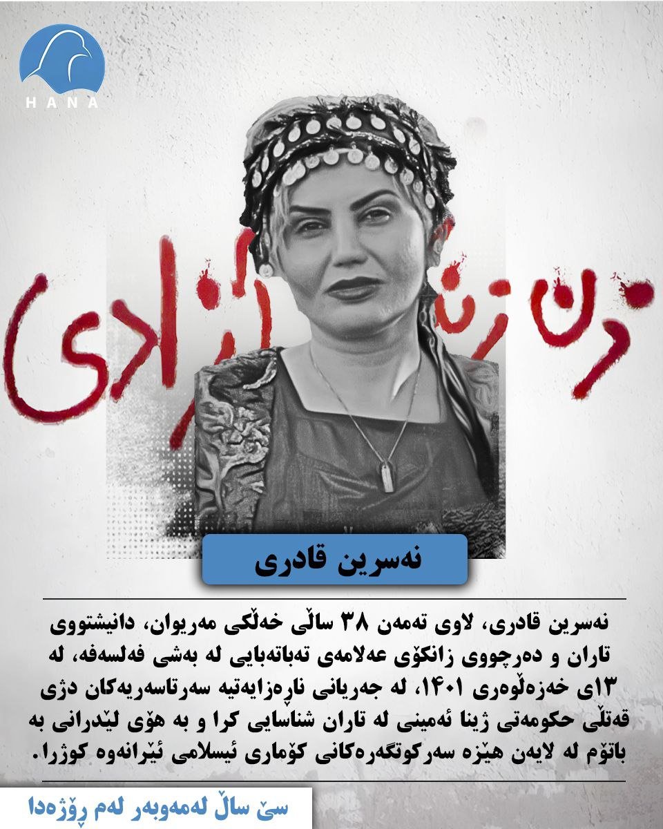 نەسرین قادری لاوی تەمەن ٣٨ ساڵی خەڵکی مەریوان، دانیشتووی تاران و و دەرچووی زانکۆی عەلامەی تەباتەبایی لە بەشی فەلسەفە، لە رێکەوتی ١٣ی خەزەڵوەری ١٤٠١، لە جەریانی ناڕەزایەتیە سەرتاسەریەکان دژی قەتڵی حکومەتی ژینا ئەمینی لە تاران شناسایی کرا و بە هۆی لێدرانی بە باتۆم لە لایەن هێزە سەرکوتگەرەکانی کۆماری ئیسلامی ئێرانەوە کوژرا.