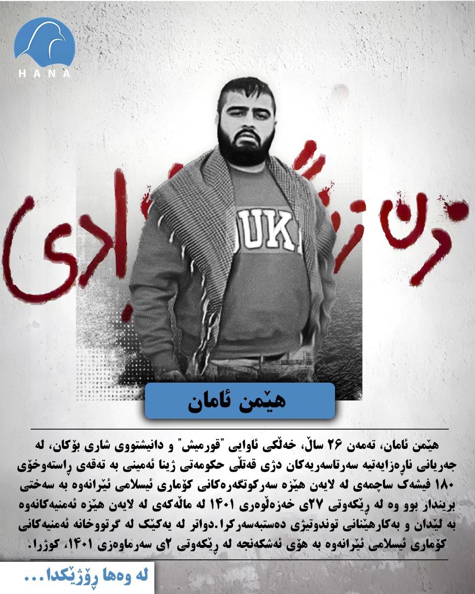 هێمن ئامان تەمەن ۲٦ ساڵ، خەڵکی ئاوایی “قورمیش” و دانیشتووی شاری بۆکان، لە جەریانی ناڕەزایەتیە سەرتاسەریەکان دژی قەتڵی حکومەتی ژینا ئەمینی بە تەقەی ڕاستەوخۆی ۱٨۰ فیشەک ساچمەی لە لایەن هێزە سەرکوتگەرەکانی کۆماری ئیسلامی ئێرانەوە بە سەختی بریندار بوو وە لە ڕێکەوتی ۲۷ی خەزەڵوەری ۱٤۰۱، لە ماڵەکەی لە لایەن هێزە ئەمنیەکانەوە بە لێدان و بەکارهێنانی توندوتیژی دەستبەسەرکرا.