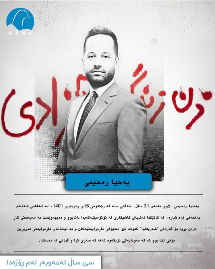 یەحیا رەحیمی، لاوی تەمەن ٣١ ساڵ، خەڵکی سنە لە رێکەوتی ١٦ی ڕەزبەری ١٤٠١، لە شەقامی شەشەم بەهمەنی ئەم شارە، لە کاتێکدا ئەشیای کاشیکاری لە ئۆتۆمبێلەکەیدا دانابوو و دەیهەوێست بە مەبەستی کار کردن بڕوا بۆ گەرەکی “شەریفاوا” کەوتە نێو شەپۆلی ناڕەزایەتیەکان و بە نیشانەی ناڕەزایەتی دەربڕین بۆقی لێدابوو کە لە مەودایەکی نزیکەوە تەقە لە سەری کرا و گیانی لە دەستدا.